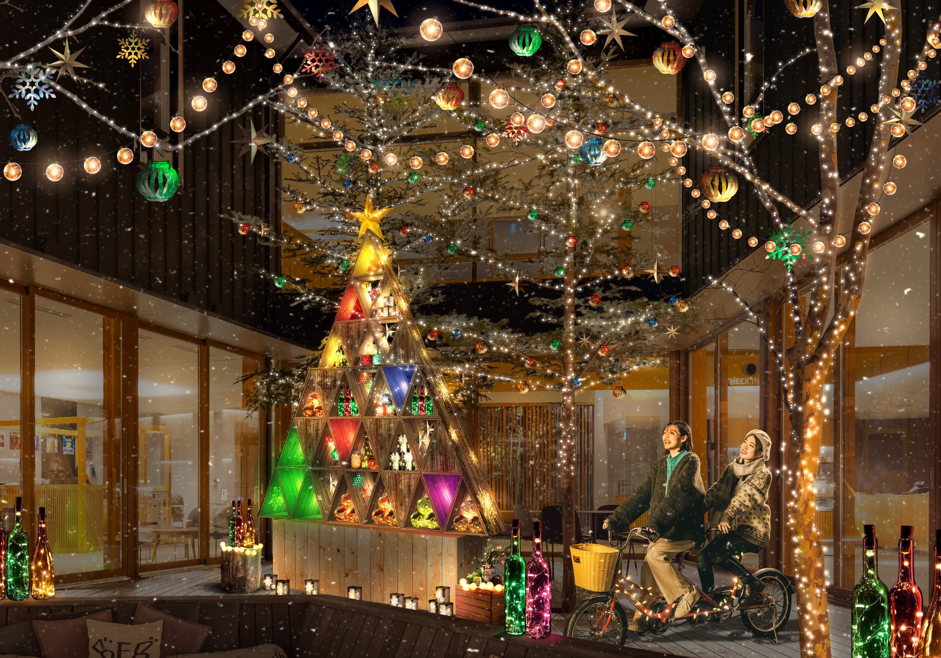 台風や積雪などでの倒木を防ぐために、定期的に手入れとして伐採されている間伐材を土台として、アップサイクル(*)したクリスマスツリーをオリジナルで作成しました。今年は、昨年よりも約1m高くなりTAMARIBA(タマリバ)の中庭に登場します。装飾にはホテル運営で生じた瓶や、缶などを合計約100本以上再利用し、色鮮やかに素敵にクリスマスツリーを彩ります。