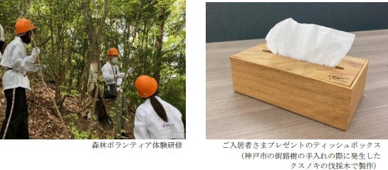 また、国産木材の活用のほかに、2022年から社員教育の一環として、分譲マンション〈ジオ〉を企画・販売する従業員等を対象にした森林ボランティア体験研修をはじめ、兵庫県神戸市によって生物多様性保全のシンボル拠点として整備されている「キーナの森」にて、間伐体験や木材コーディネーターによる森林保全のワークショップなどを実施しています。