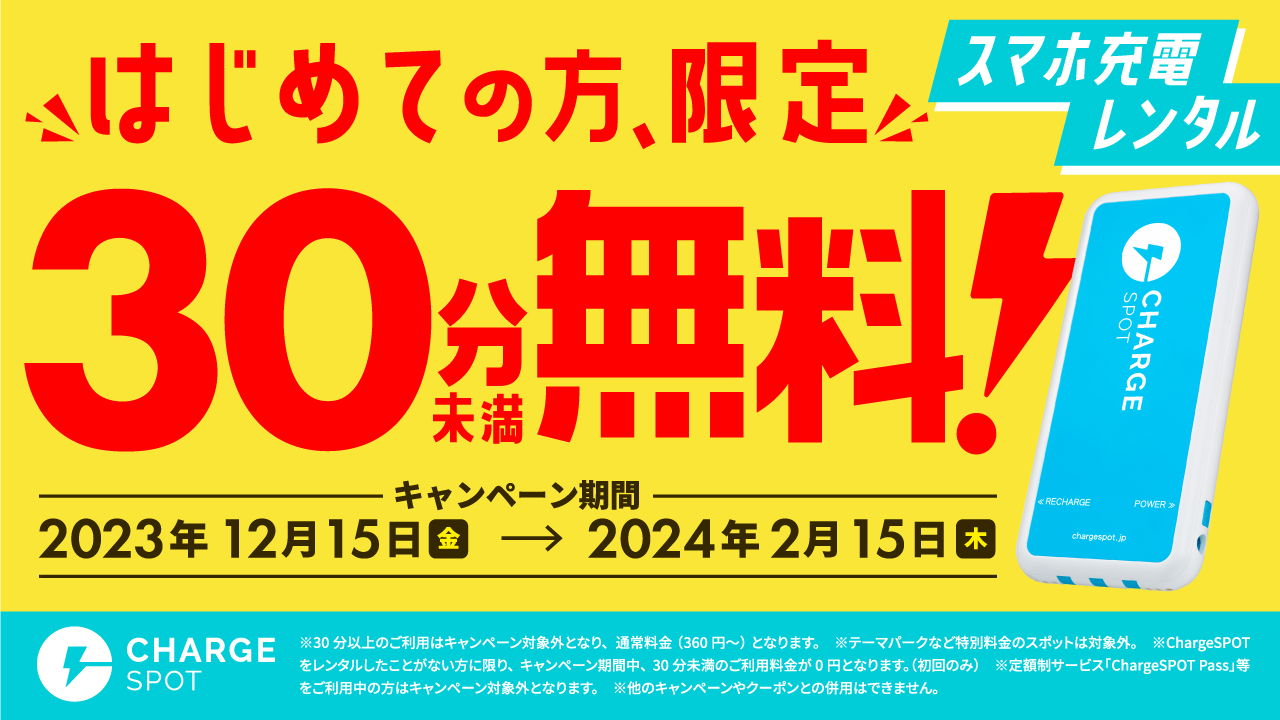 キャンペーン内容:期間中、「ChargeSPOT」を利用したことがない方に限り、30分未満の利用料金が初回のみ無料になるキャンペーンです。30分以上の利用はキャンペーン対象外となり通常料金(360円〜)が発生します。