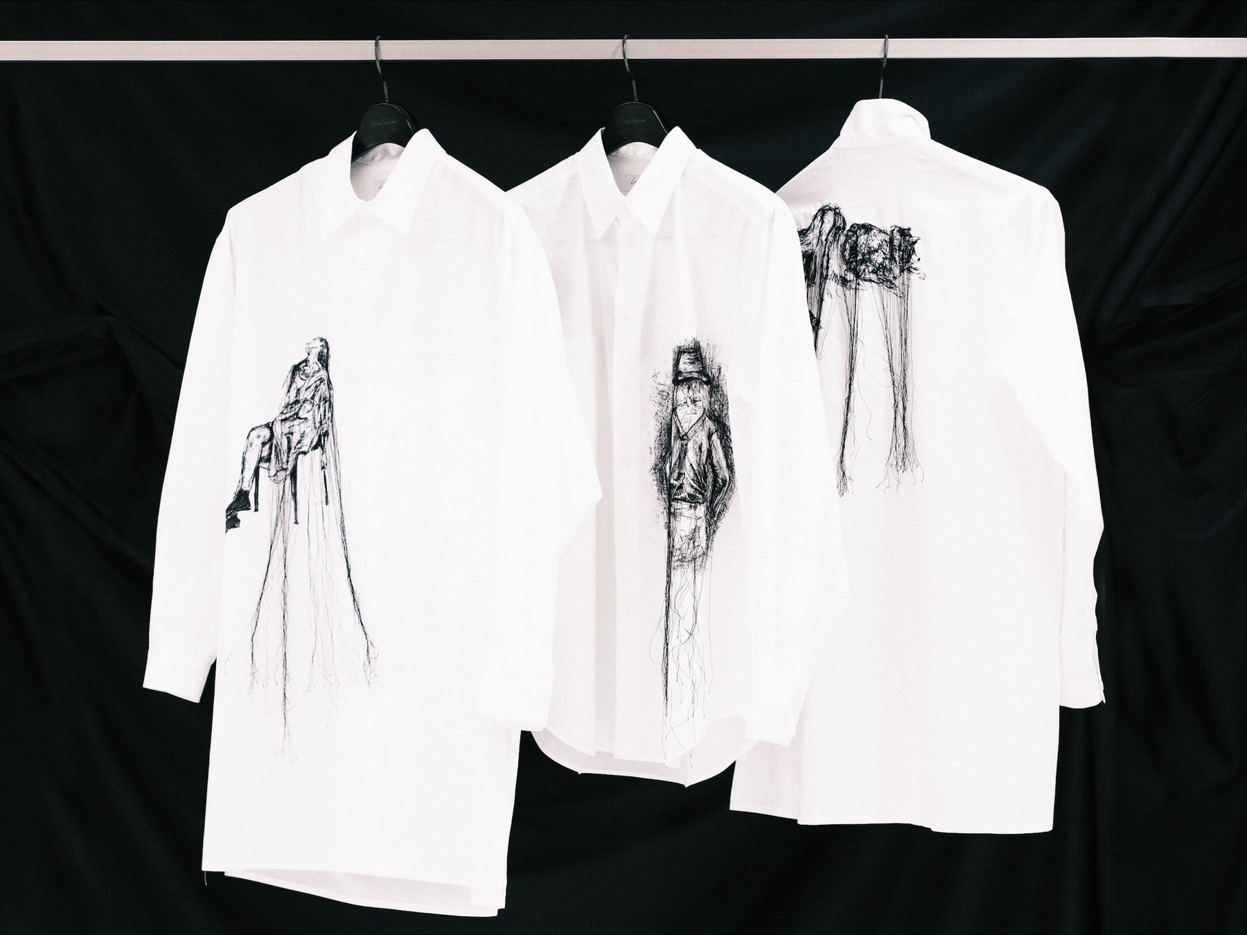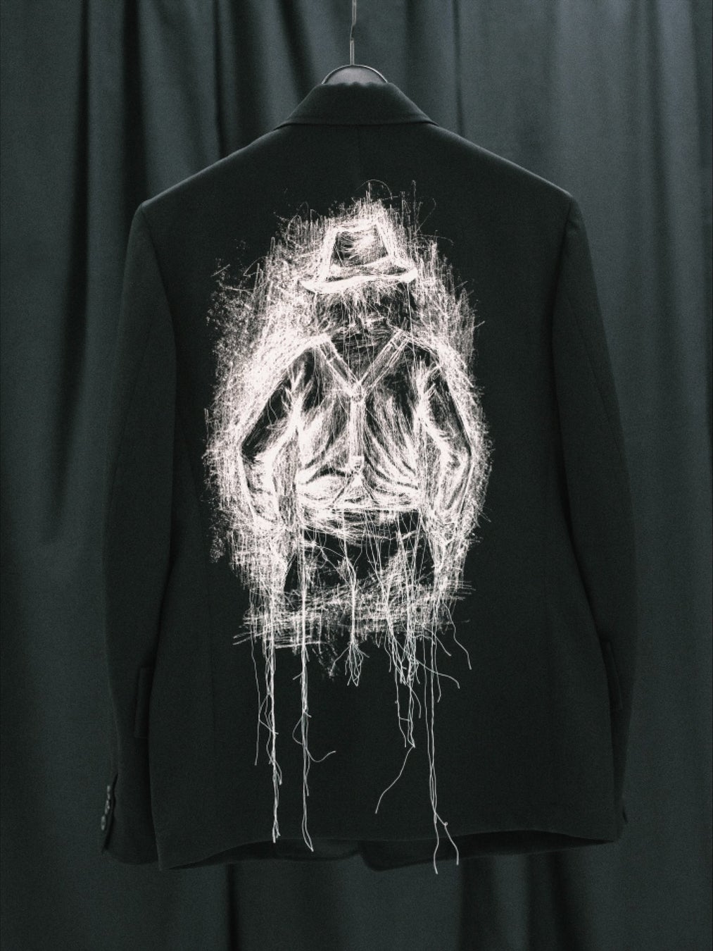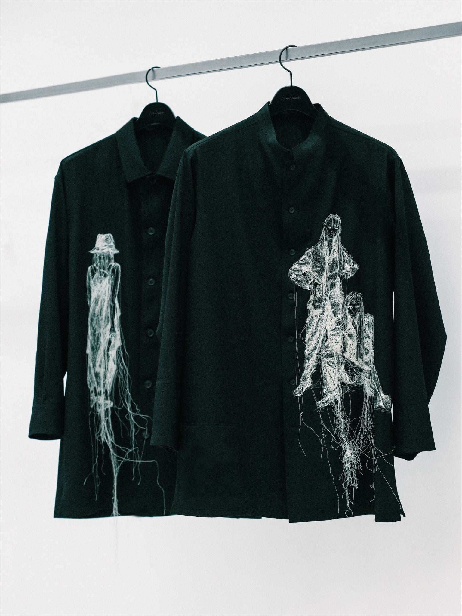 Yohji Yamamoto POUR HOMMEより、 スペシャルアイテムとして、定番素材の「ウールギャバジン」や「コットンブロード」に、繊細なドローイングのアートワークを、職人の手により、一色ずつ丁寧にプリントした「手捺染」と、高い技術を誇る群馬県「桐生市の刺繍」の二つの技法を重ね合わせて表現したジャケット、シャツを展開いたします。