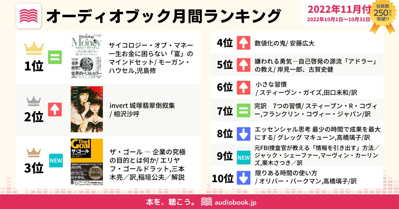 日本一のオーディオブック書籍ラインナップ数(※)を配信する「audiobook.jp」を運営する株式会社オトバンク( 本社:東京都文京区、代表取締役社長:久保田裕也、以下「オトバンク」)は、当社が運営する会員数が250万人を突破した日本最大級のオーディオブック配信サービス「audiobook.jp」におけるオーディオブック月間ランキング11月付(2022/10/1~10/31)を発表します。