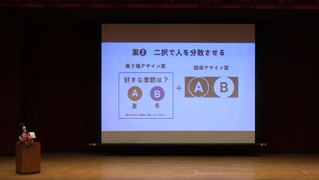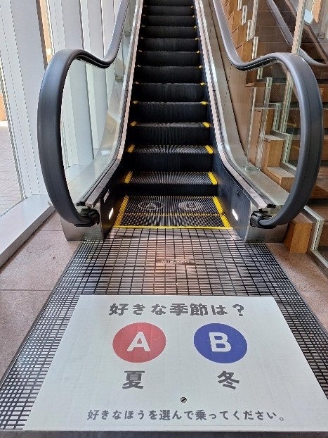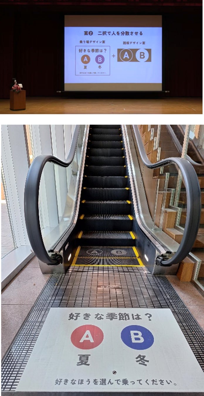 乗る前のランディング・プレート(踏板)に「犬派?猫派?」といった選択肢を示し、ステップに選択のデザインをすることで、自然と左右に振り分けることで意識的に左右に分かれて立ち止まるような仕掛けです。本学での実装の際は、好きな季節は「夏?冬?」の選択をするデザインを設置しました。