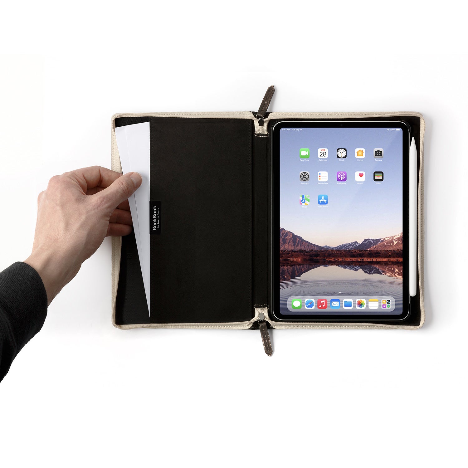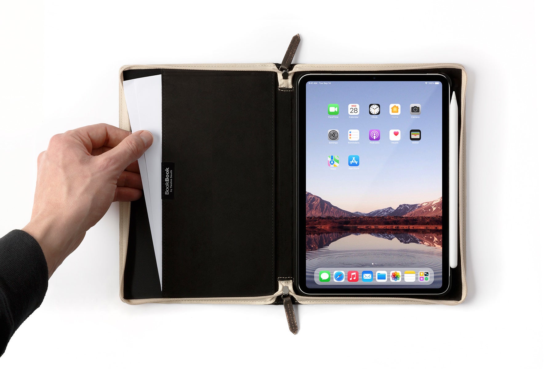 BookBookに装着した状態でiPadにApple Pencilをセットできるスペースを確保。もうApple Pencilを見失うようなことはありません。また、反対側のポケットには書類やケーブルなどの収納も可能です。