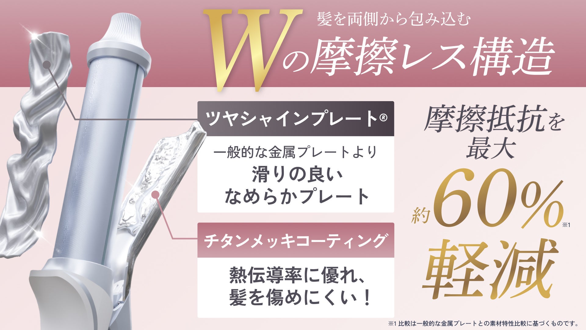 パイプ面とクリップ内側の両方に特殊加工を施した“W摩擦レス構造”を採用。髪を包み込むように熱を伝え、摩擦を最大約60%軽減します。さらに、高温でも髪内部の水分を守るツヤシャインプレート®を搭載。200℃でも水蒸気爆発を防ぎ、うるおいとツヤを長時間キープします。熱伝導に優れたチタンメッキコーティングにより、ムラのない熱で毛先までしっとりとした美しいカールを実現します。