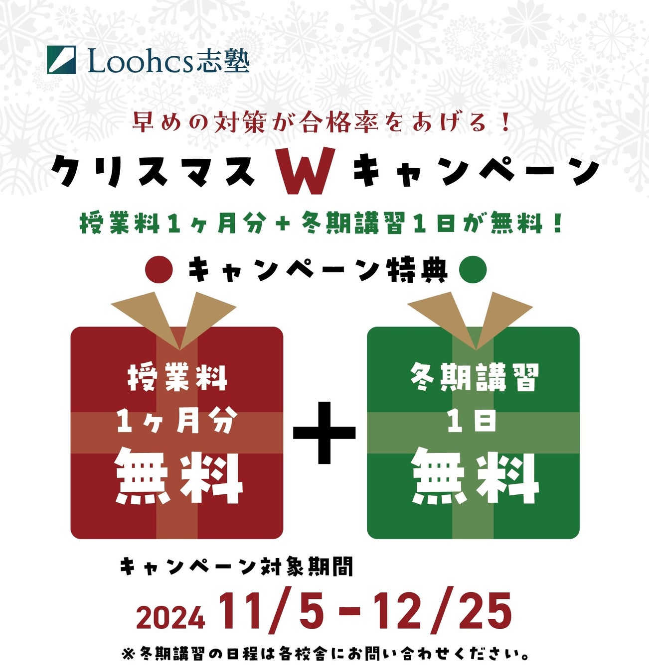 現在Loohcs志塾では、入塾月の授業料が無料+冬期講習1日分を無料で受講することができるクリスマスWキャンペーンを実施中です。高1・2年生を中心に少しでも多くの学生の合格チャンスを作るためのキャンペーンになりますので、今から総合型選抜入試やAO入試の受験を考えている学生の皆さんはぜひご応募ください。