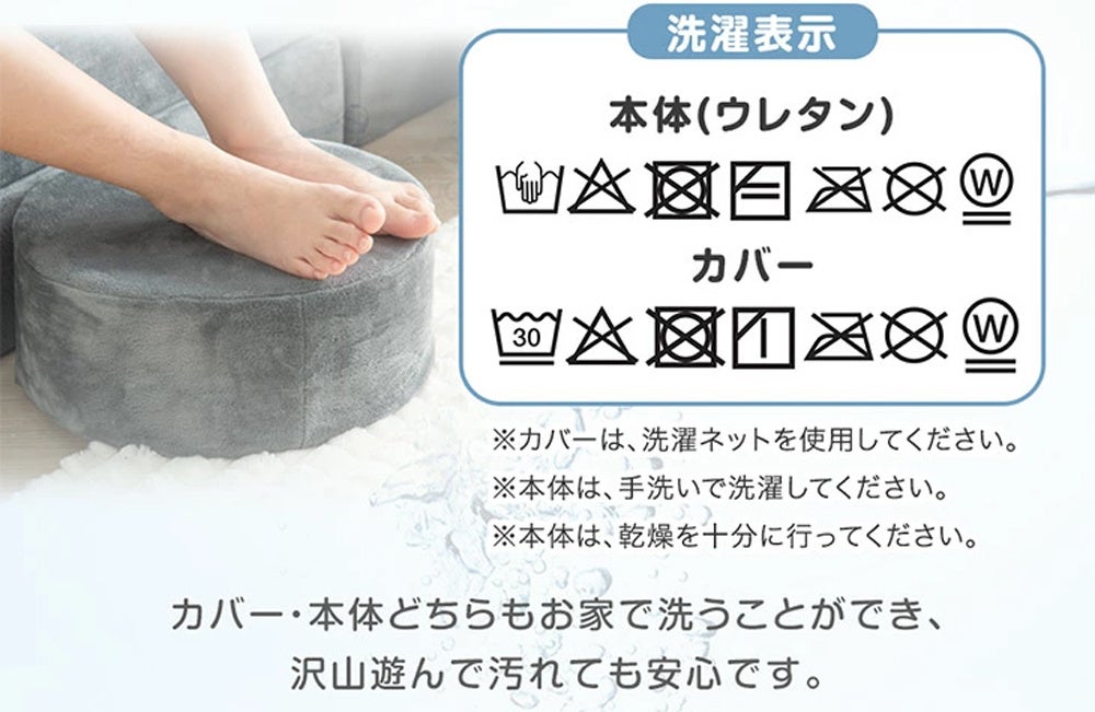 本製品はカバーだけでなく、中材のウレタンまで洗うことができるようになっております。ソファとして使用している中で蓄積される汚れや、お子様が遊んでいる中で汚れてしまった場合でも、丸ごと洗濯が可能となっているため清潔に使用することができます。また、低ホルムアルデヒドなので肌が敏感な方や小さなお子様にも安心してご使用いただけます。