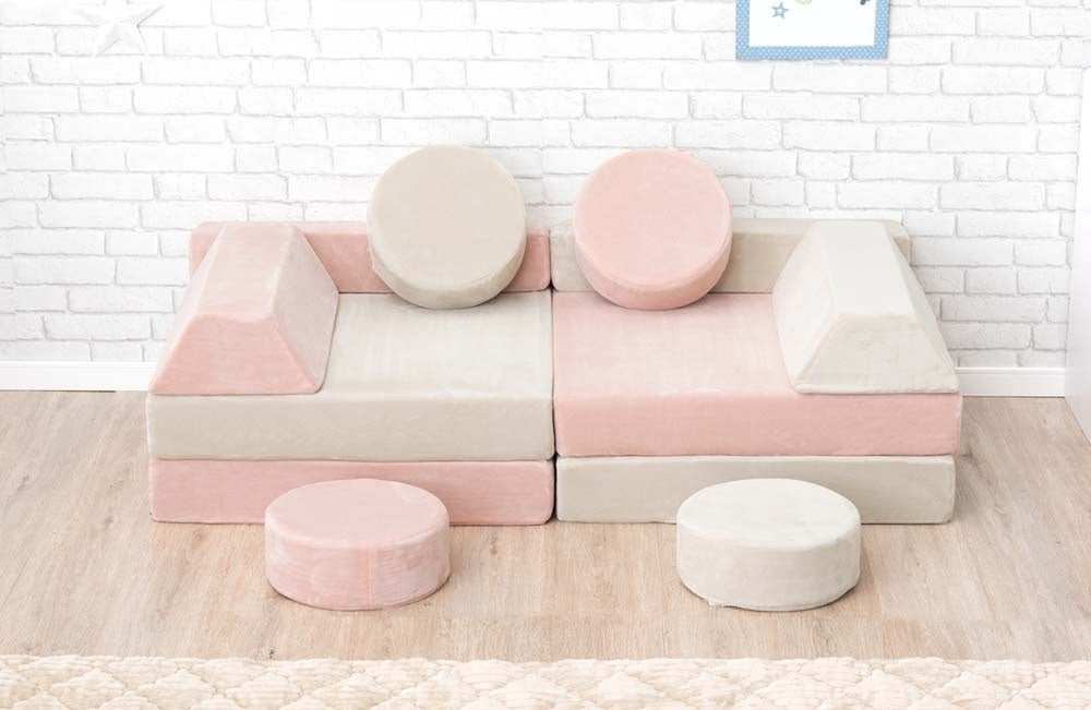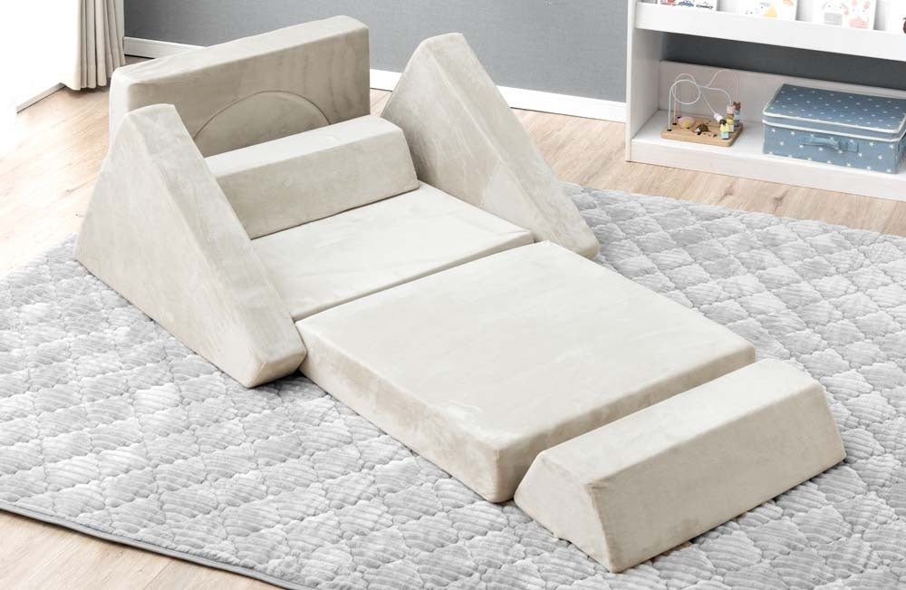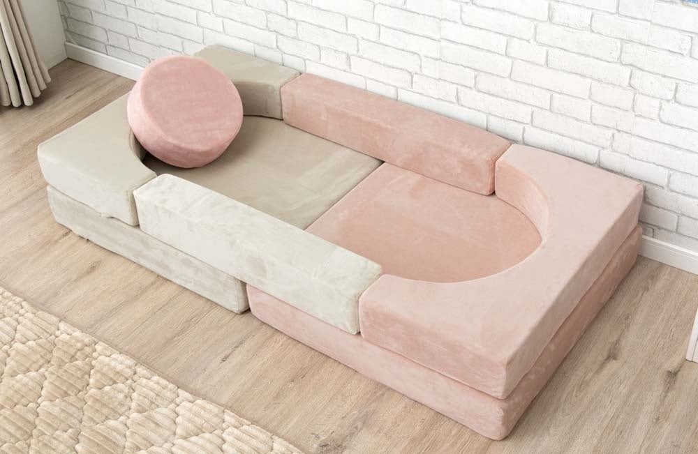 タンスのゲンの『つみきソファ』はブロックパーツが16個セットになっており、各パーツを繋ぎ合わせて好みのレイアウトで使用することができるブロックソファと同様の製品となりますが、一般的なブロックソファと違い、『つみきソファ』はそれぞれのパーツが円形や四角形、半円形、アーチ型、三角形など7種類のユニークな形になっています。その為、“つみき”のようにお子様が組み立ててソファ以外の形にして遊ぶことが可能です。多彩なパーツを用意したことにより、組み合わせパターンは無限に広がり、お子さまが飽きずに楽しく遊ぶことができます。さらに集中力・思考力・独創力・空間認識力などの向上を促し、知育家具としての役割も果たします。