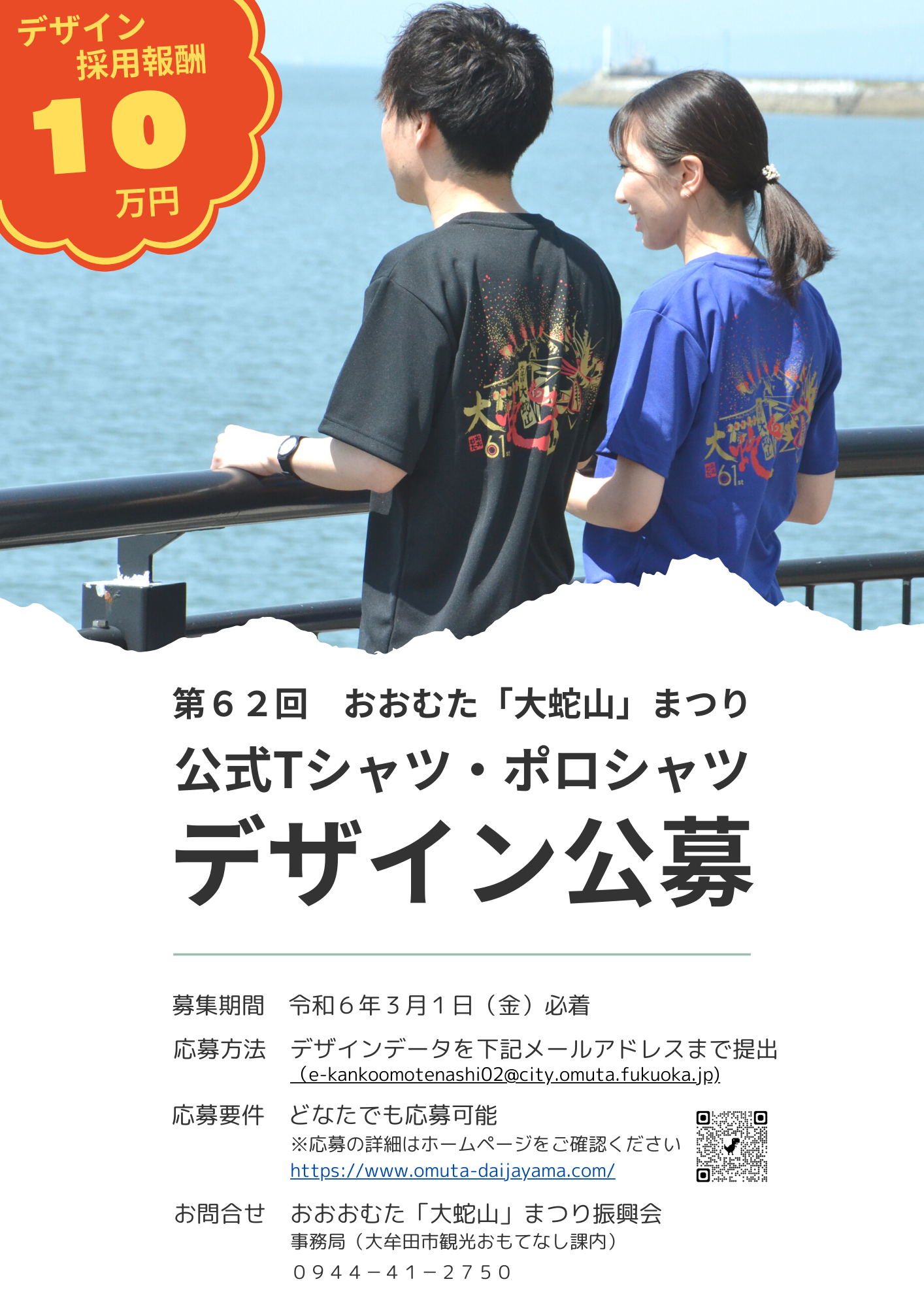 今年の第62回おおむた「大蛇山」まつり開催に向けて、まつりのムードの盛り上げに欠かせない「公式Tシャツ・ポロシャツ」のデザインを募集しています。詳細は「募集要領」をご確認ください。大勢の方からのご応募をお待ちしています!
