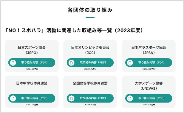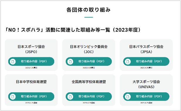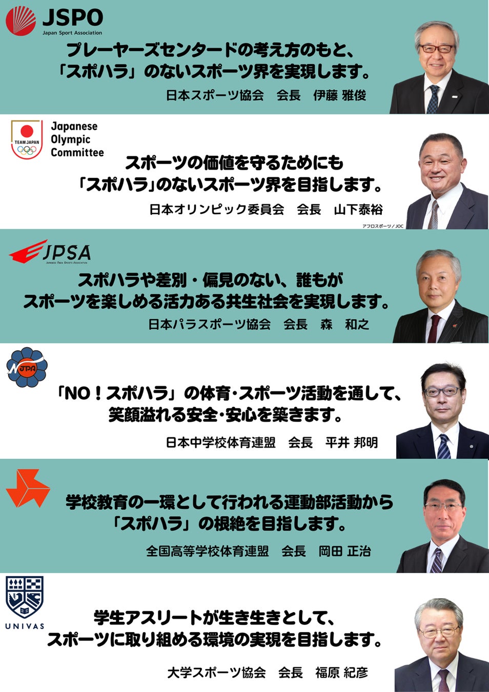 当協会および日本オリンピック委員会(JOC),日本パラスポーツ協会(JPSA),日本中学校体育連盟,全国高等学校体育連盟,大学スポーツ協会(UNIVAS)の6団体は、共同で、2023年度を啓発強化元年とし、「NO!スポハラ」活動を通じて、だれもが安全・安心にスポーツを楽しめる社会を目指します。