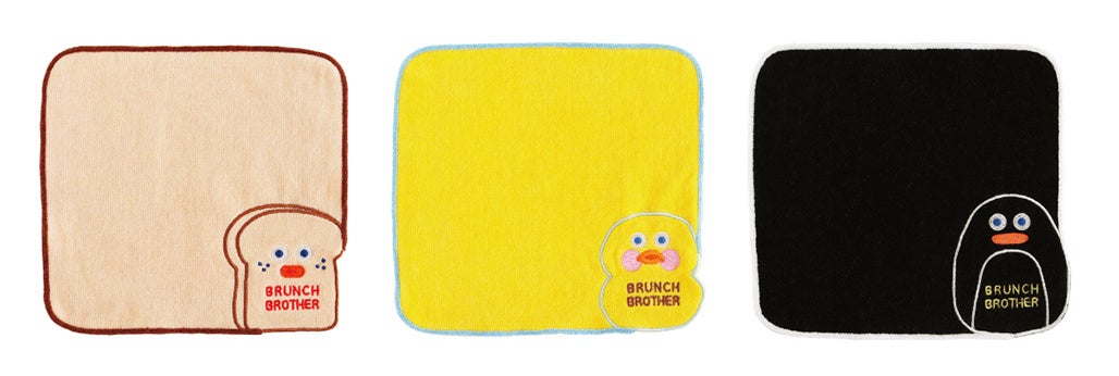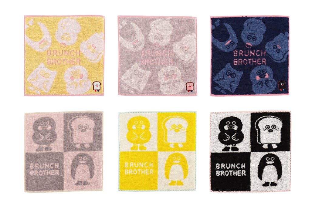 ブランチブラザーのキャラクター達が全員集合したタオルハンカチやトースト、ダッグ、ペンギンとロゴをそれぞれ4カ所にデザインした一枚。畳み方をかえると見えるキャラクターが異なり、気分次第で好きなキャラクターを楽しめる贅沢なタオルハンカチです。
