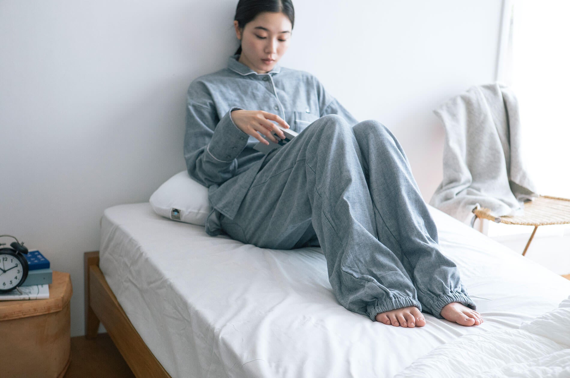 特徴1 そでとすそは長めの12分丈。眠るとき以外は手足を出して過ごせます。
