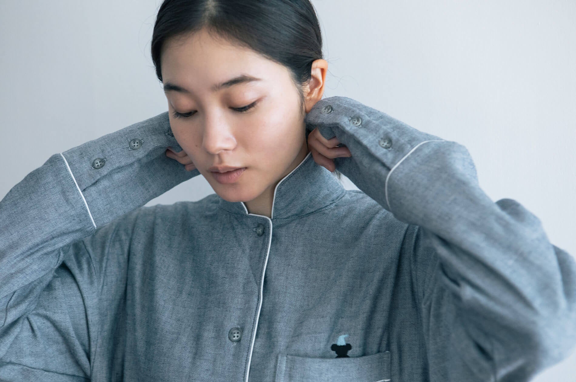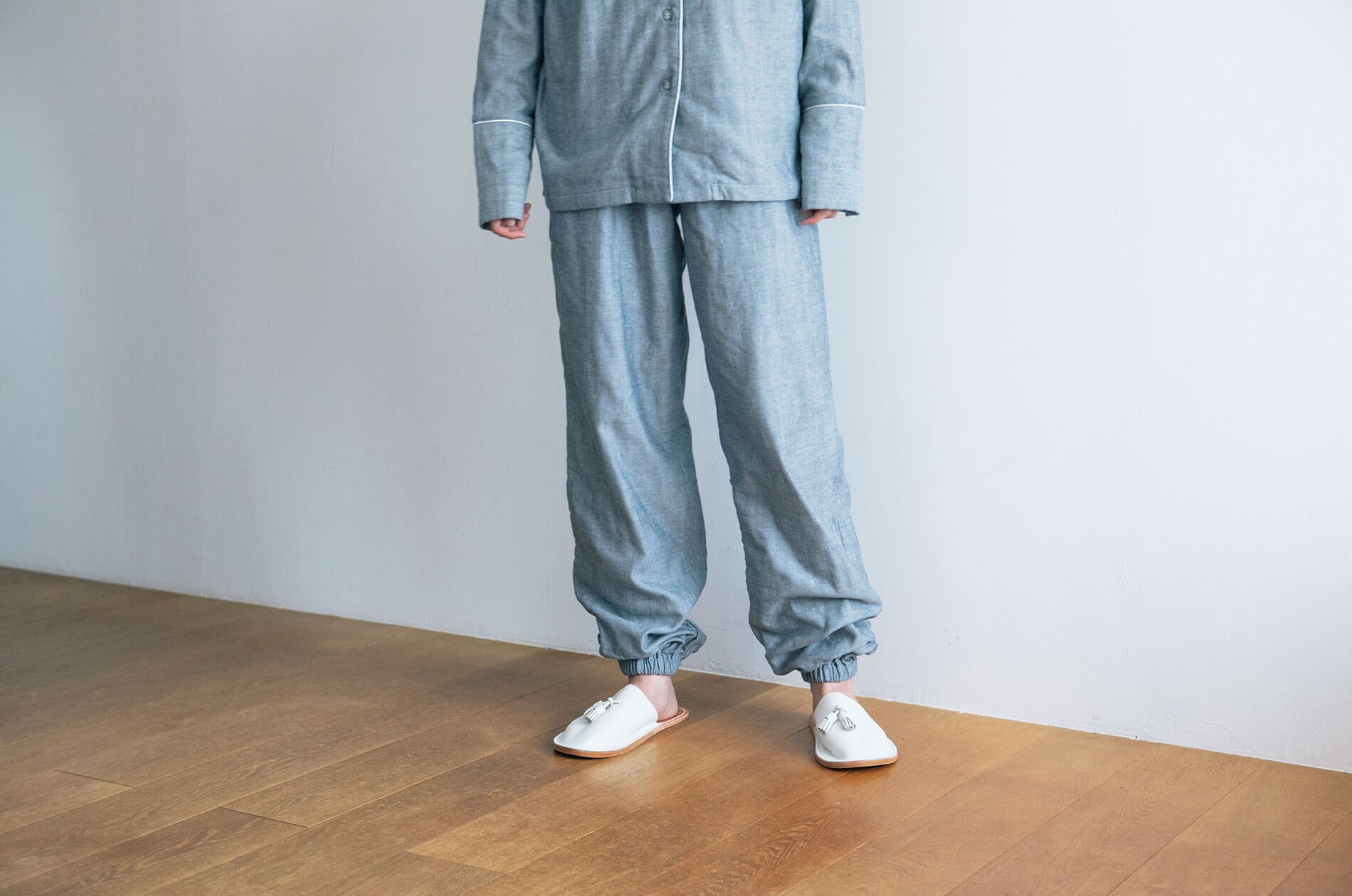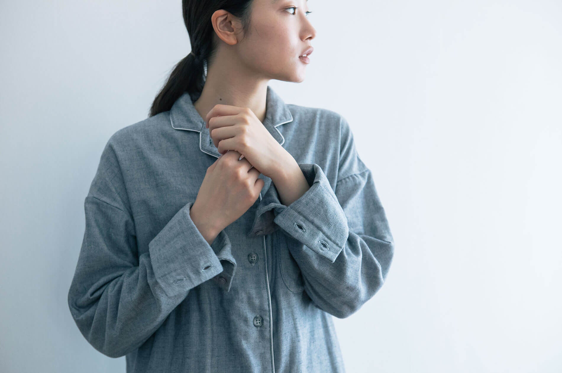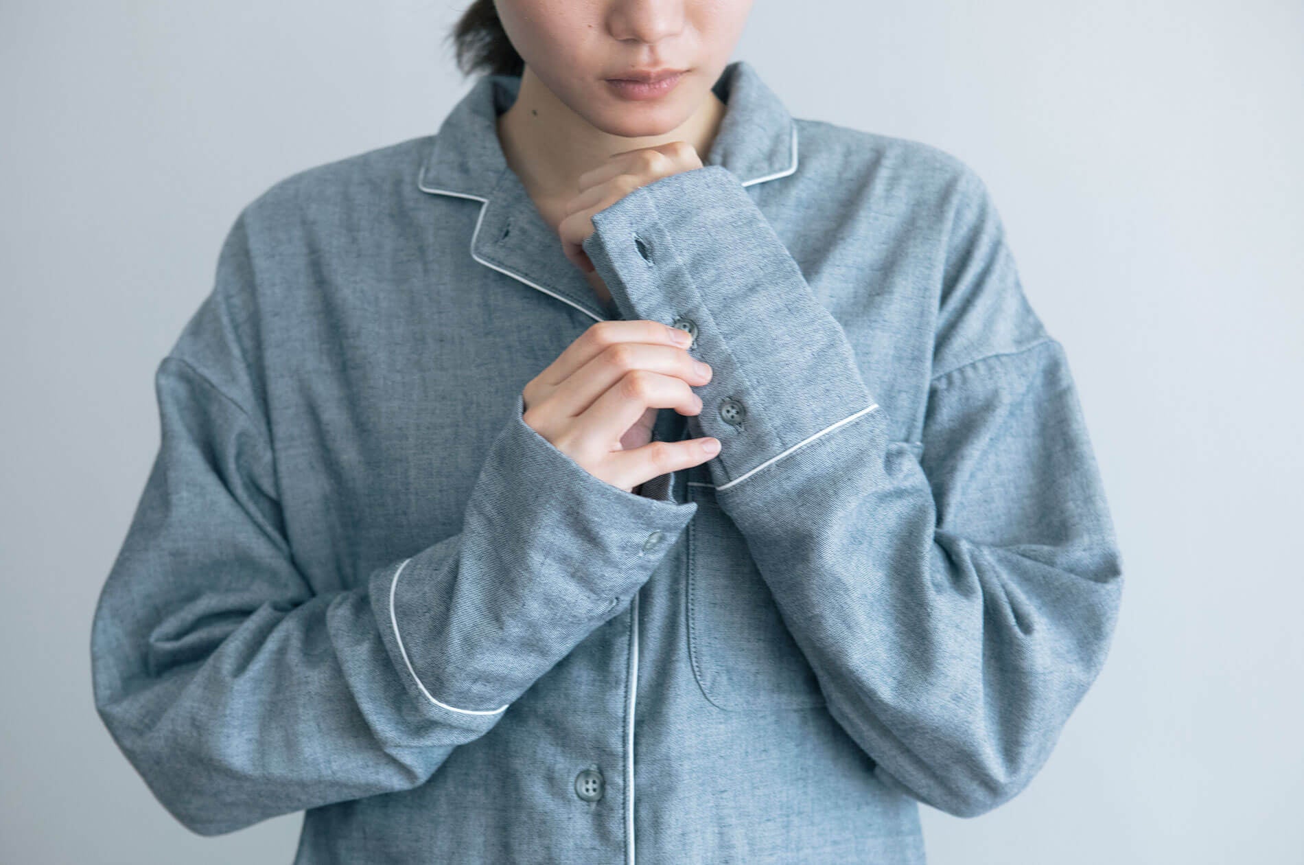 12分丈のすそとそでが、手首や手の甲、足首や足の甲までくるんで、眠るときに冷気から守ります。そで口にはボタンがついていて、ズボンのすそ口にもゴムが入っているので、そで口を上げれば歯磨きや水仕事もできますし、ズボンもすそを足首まで上げれば、歩くときにすそが床につくこともありません。