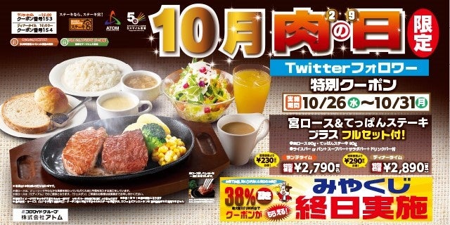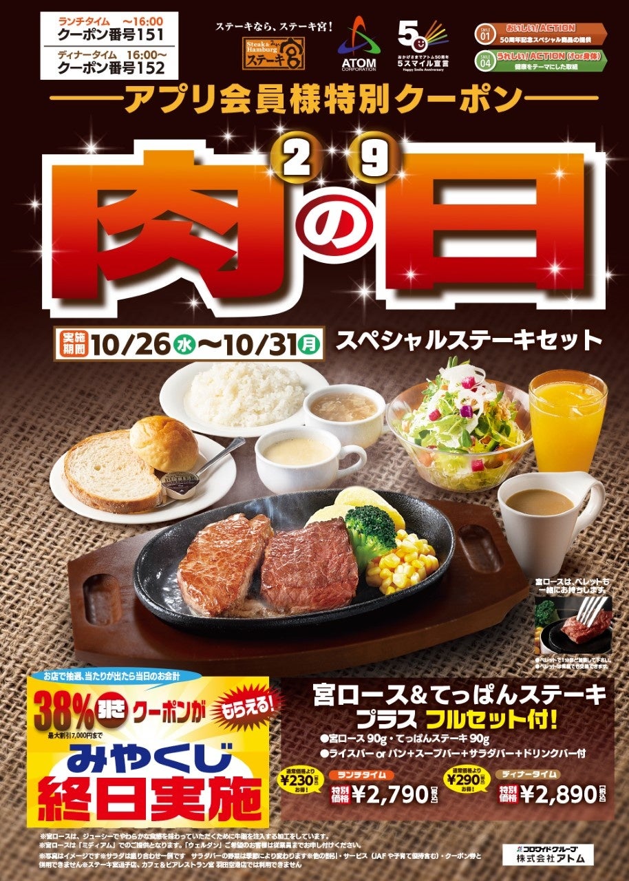 コロワイドグループの株式会社アトム(本社:神奈川県横浜市、代表取締役社長:山角豪)は、「ステーキ宮」各店で、2022年10月26日(水)から、2022年10月31日(月)までの6日間、「肉の日スペシャルステーキセット」をアプリ会員とTwitterフォロワー限定で販売いたします。