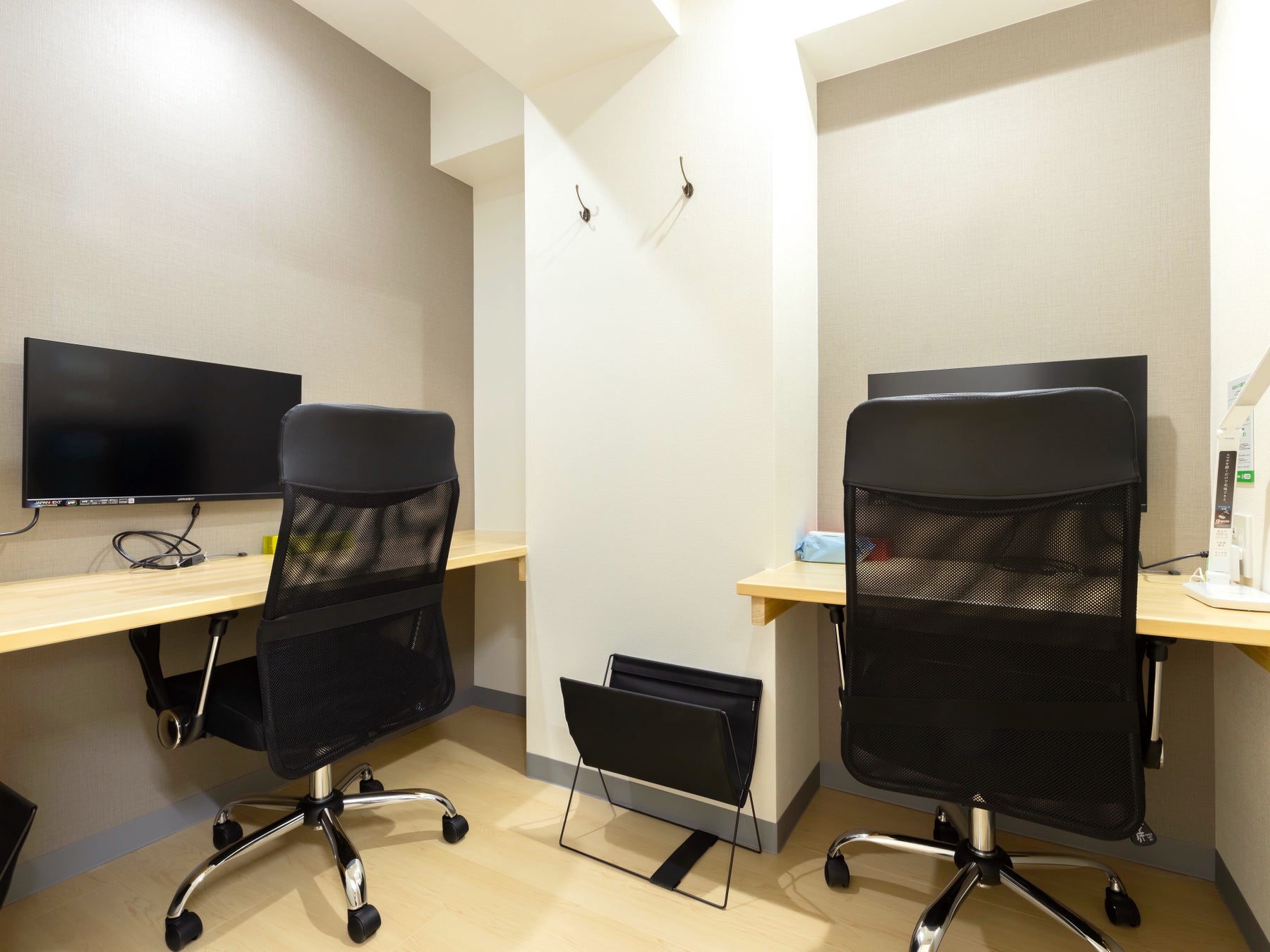 個室は1名用だけでなく、2名用個室もご用意。商談や会議前に打ち合わせしながら準備したり、ディスカッションしながら資料作成するときにも便利です。