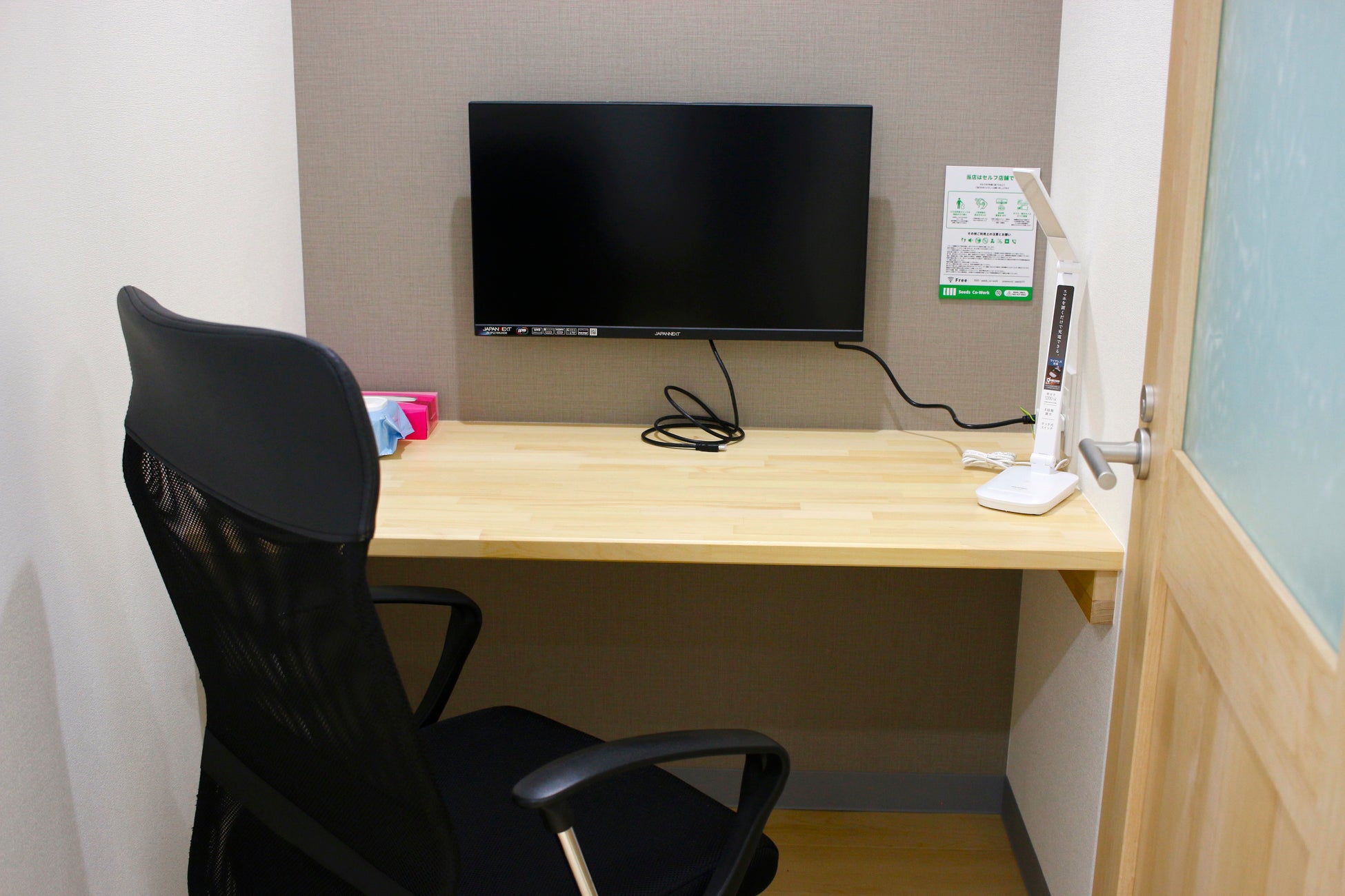 完全個室は机幅が広く、長時間の利用でも快適にお過ごしいただけます。全室モニター完備のため、web会議はもちろん、いつも以上に集中して仕事・勉強したいときにぜひご利用ください。