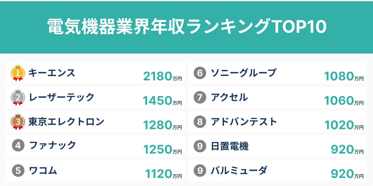 3位は東京エレクトロン、2位はレーザーテック。1位はお馴染みのあの企業!電気機器業界年収ランキングTOP10/SalesNow DBレポート