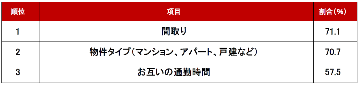 次いで、2位は「物件タイプ(マンション、アパート、戸建など)」が70.7%で1位の「間取り」との差は0.4ポイントでした。「将来設計を踏まえた条件として設定すべきであり、夫婦間の意識相違を生まないため」「これから長く住む家であれば、必須条件だから」など、これから長年住み続けるためにも物件タイプをすり合わせしておくべきという声が挙がりました。