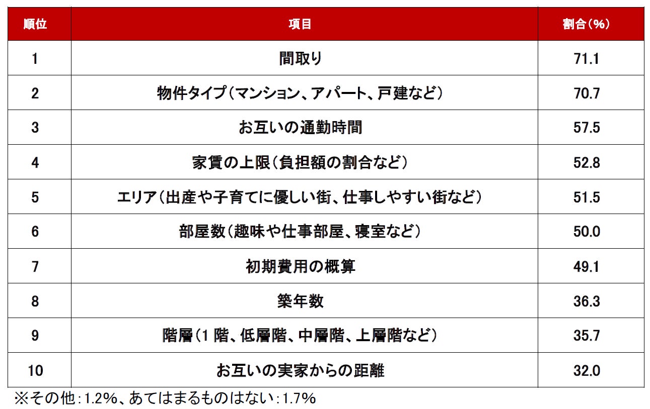 【調査結果】「新婚夫婦が住まい探しをする前に、すり合わせておくべき条件」ランキング