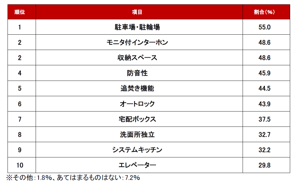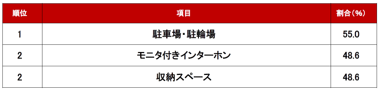 次いで2位は「モニタ付きインターホン」「収納スペース」が同率で48.6%でした。不動産会社からは「防犯上、モニタ付きインターホン等は考慮すべき」「共働きの夫婦の場合、収納スペース等は特に必要と思われる」といったコメントが寄せられました。安全かつ、快適な住環境を求めるには外せないポイントと見受けられます。
