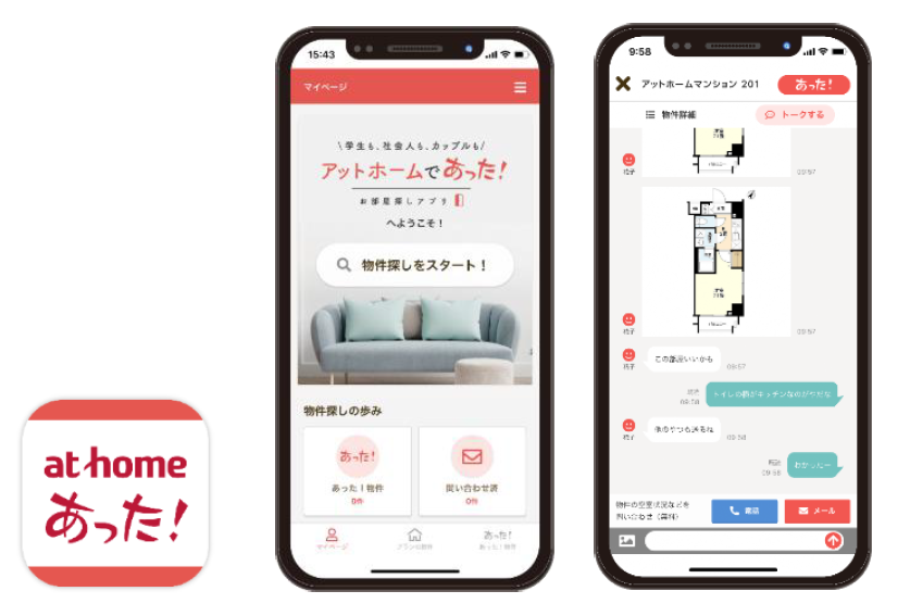 アットホームは大学・短大・専門学校の学生・その保護者、社会人、カップルのためのお部屋探しアプリ「お部屋探しアプリ アットホームであった!」を提供しています。学生や社会人だけでなく、ふたり暮らし向けの機能も充実しています。一緒に住む方と気になるお部屋を共有し、それぞれこだわりたいポイントについて自由にトークできるペアリング・トーク機能や、ふたりの希望条件とお部屋の条件がどのくらい合っているかがわかる「合致度(%)」が表示されるので、ふたりの希望に合ったお部屋を決めることができます。
