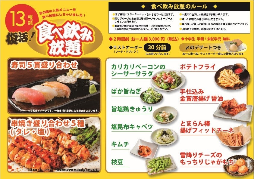 金の蔵の大人気「食べ飲み放題」が復活!寿司&焼き鳥と定番メニューが2時間食べ放題