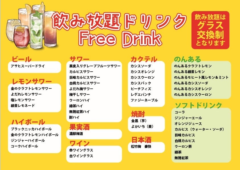ビール(アサヒスーパードライ)・ハイボール・レモンサワー・カクテル・サワー・ワイン・焼酎・日本酒・果実酒・のんある・ソフトドリンク