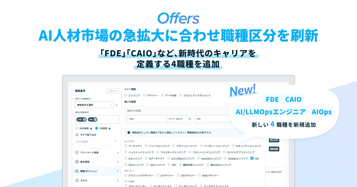 Offers、AI人材市場の急拡大に合わせ職種区分を刷新。「FDE(フォワードデプロイドエンジニア)」「AIOps」「CAIO」など、新時代のキャリアを定義する4職種を追加