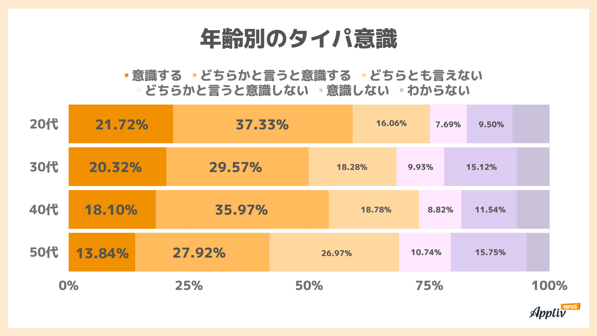 「意識する」「どちらかと言うと意識する」の合計は20~40代が5割程度ですが、50代は約4割と少し少なくなっています。