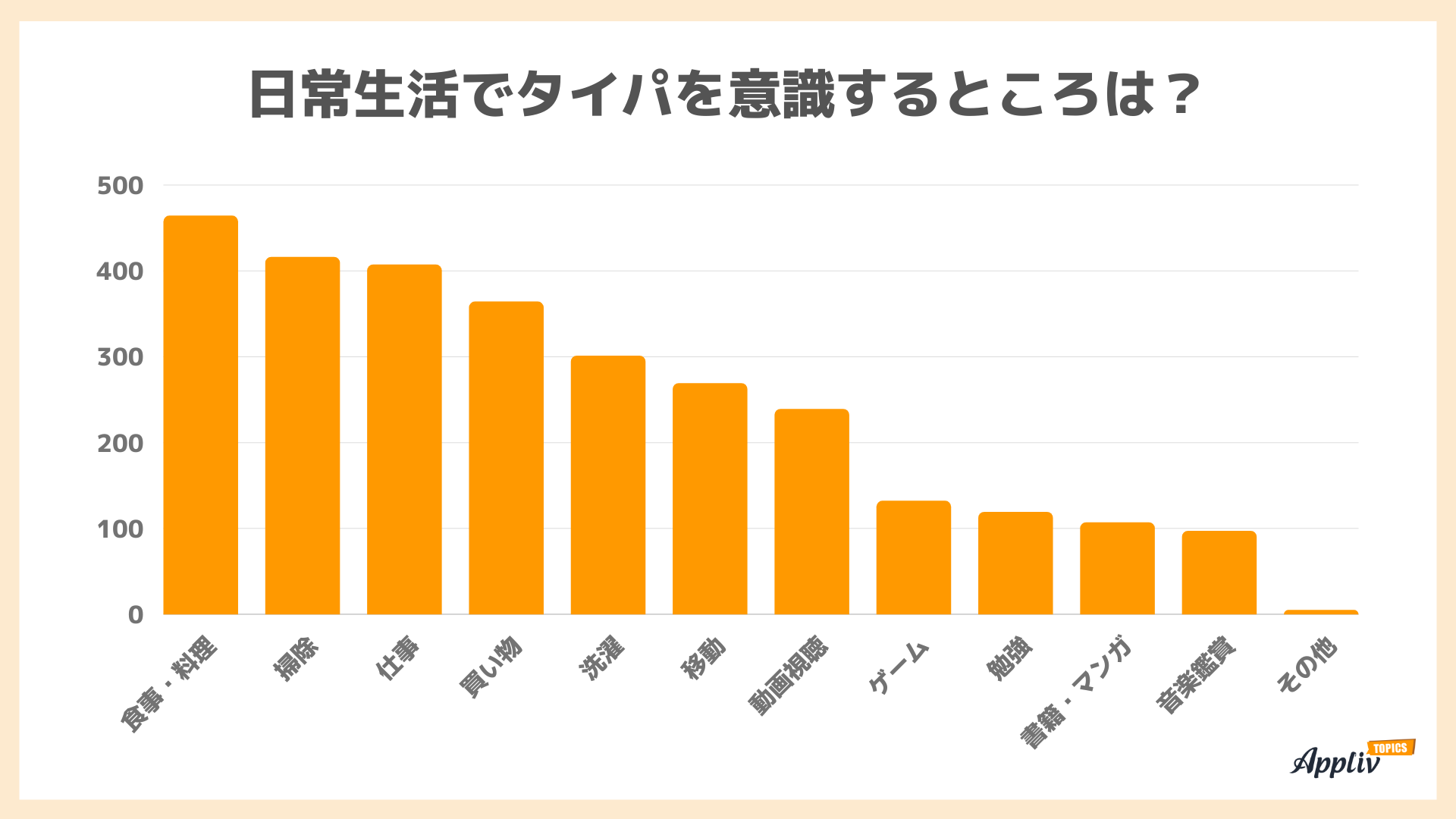 その後、「掃除」416人、「仕事」407人、「買い物」364人、「洗濯」301人と続きます。家事のタイパに関心が高いようです。
