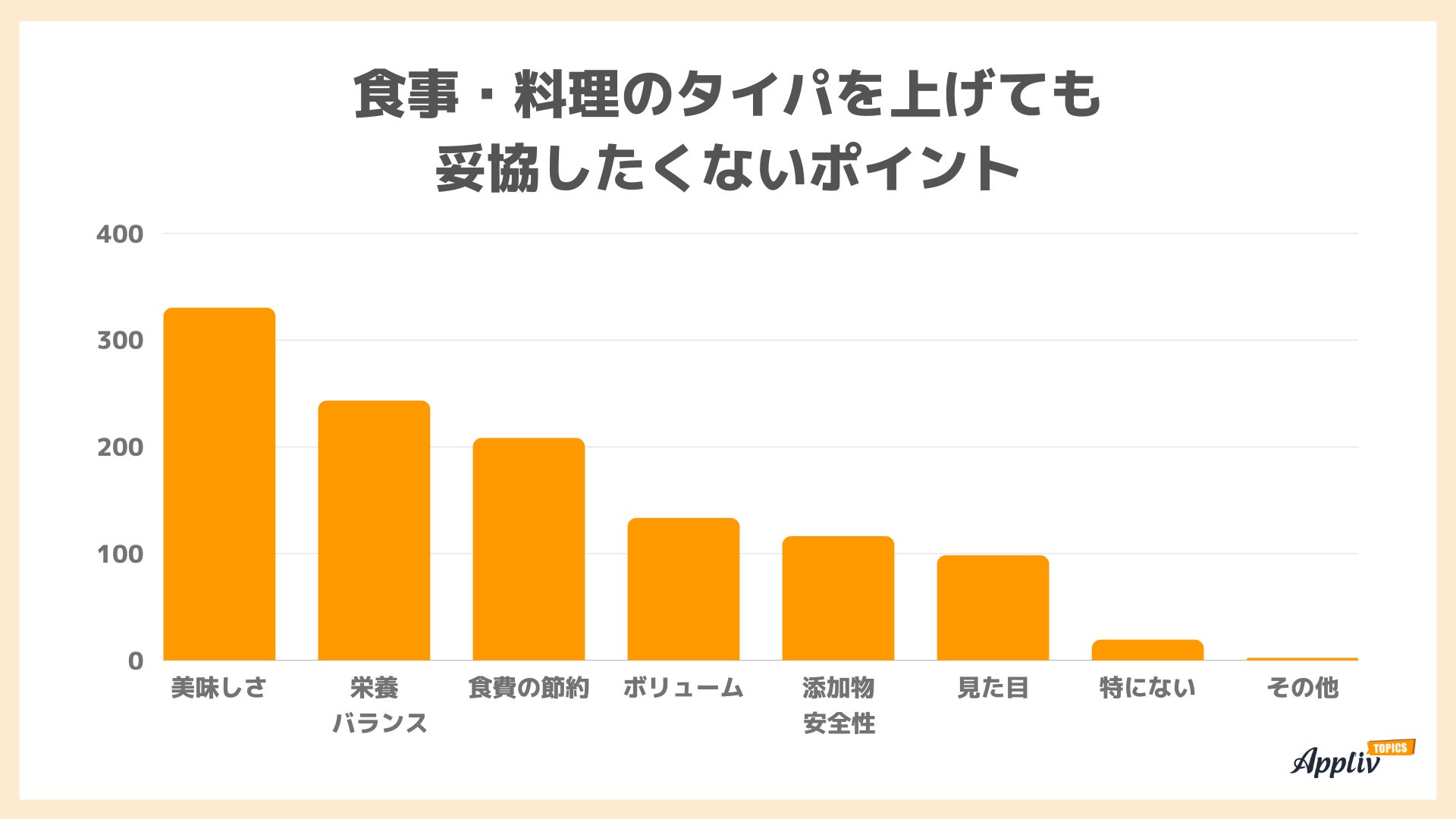 「栄養バランス」も過半数の243人が選択しており、美味しくてヘルシーな食事をしたいと思っている方が多い結果になりました。