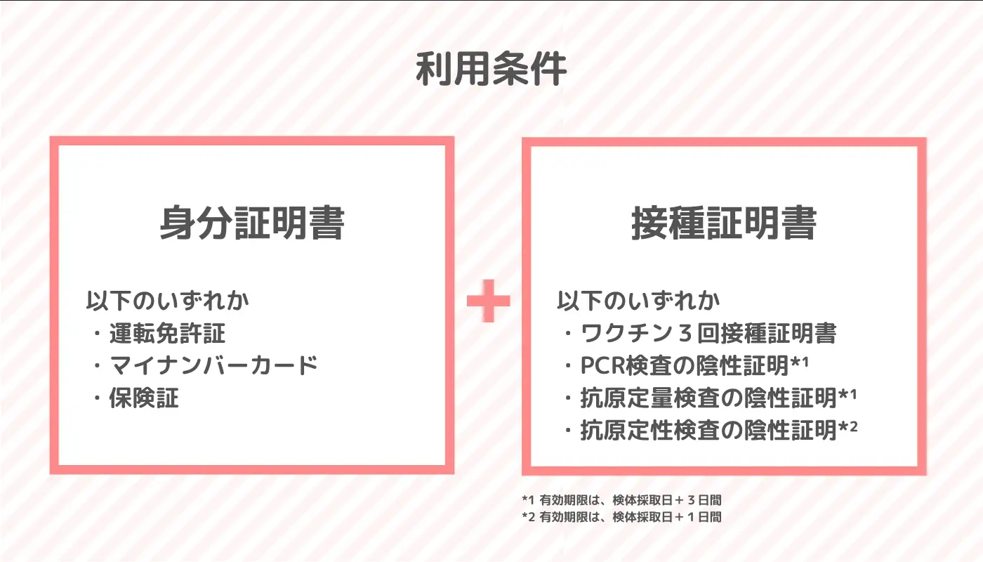 キャンペーンをご利用の際は、感染防止対策の徹底をお願いします。 ワクチン接種歴(3回)又はPCR検査等で陰性であることが確認できることが条件となります。