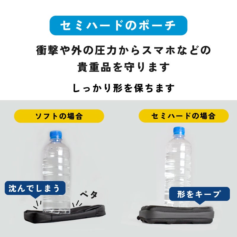 セミハードタイプで衝撃や外の圧力からスマホなどの貴重品を守ります。