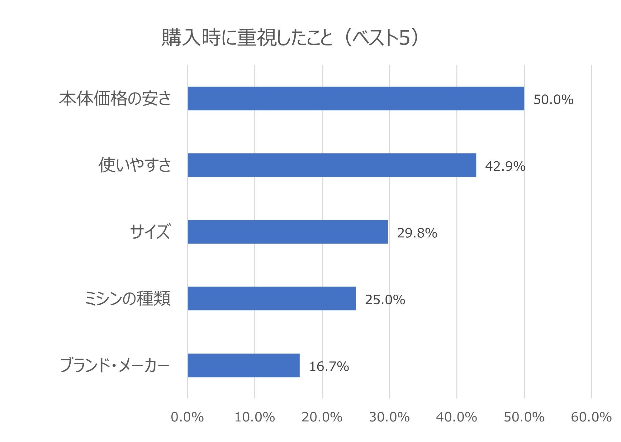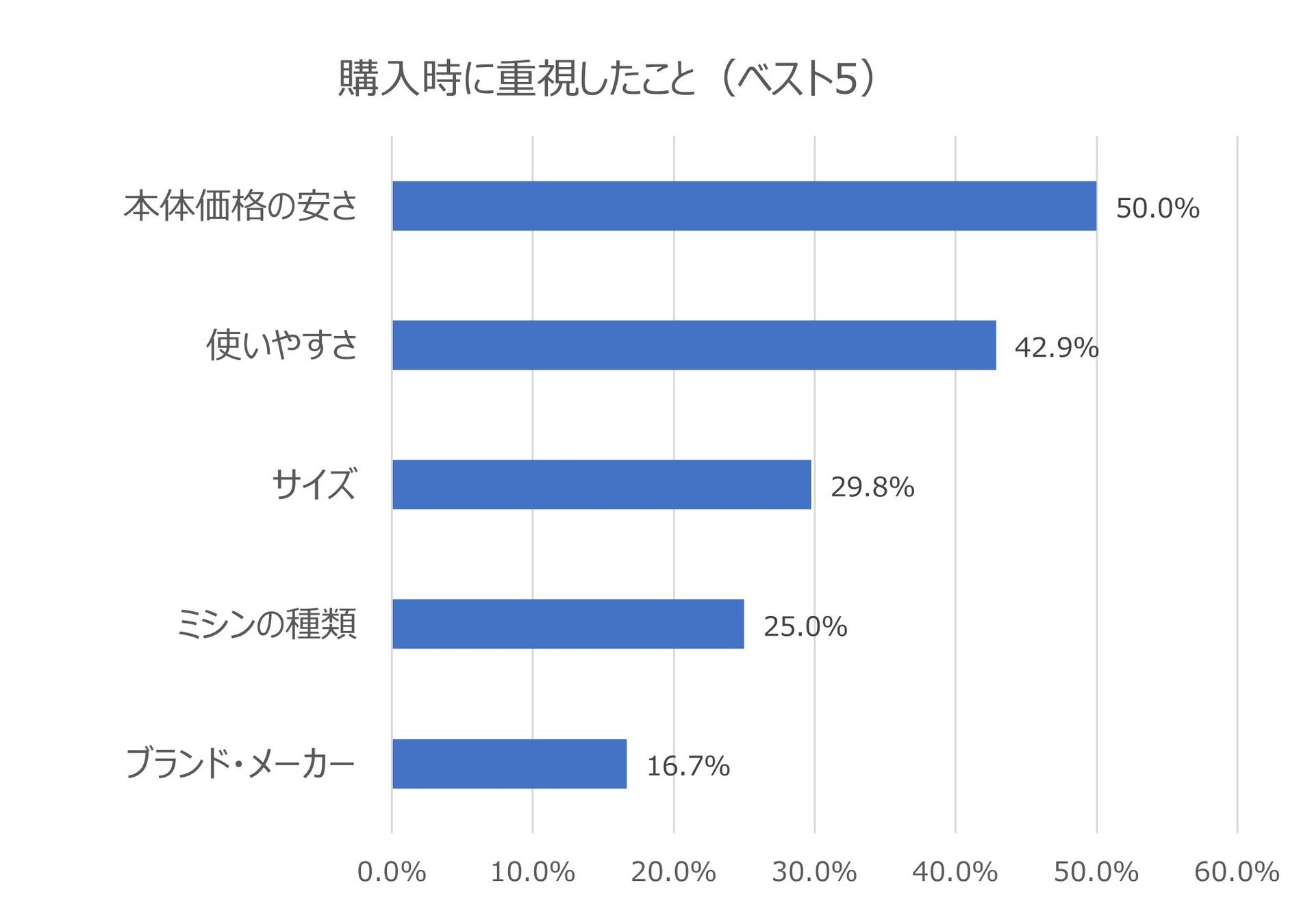 購入時に重視したことは、「本体価格の安さ」 (50.0%)が1位に。次いで「使いやすさ」 (42.9%)、「サイズ」 (9.8%)、「ミシンの種類」(25.0 %)、「ブランド・メーカー](16.7%)という結果になりました(複数回答)。