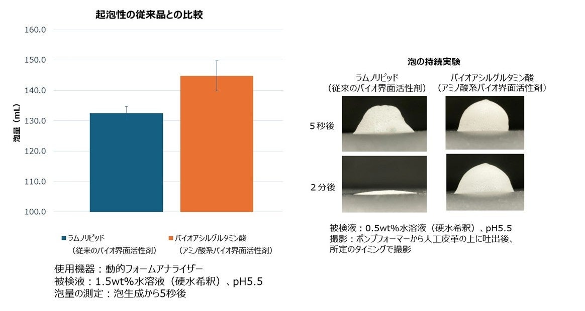 微生物が産生するバイオ界面活性剤は、天然由来で生分解性が高く、環境負荷が低いことから注目を集めており、技術革新やコスト低減を背景に市場は急速に拡大しています。現在、世界におけるバイオ界面活性剤市場は、2021年から2030年にかけて年率13%の成長が見込まれています※3。しかしながら、従来のバイオ界面活性剤には、泡立ちの弱さ、着色、におい残りといった点で、化粧品への利用が難しいという課題がありました※4。今回開発した発酵法を用いた新製法によって製造される「バイオアシルグルタミン酸」は、アミノ酸系界面活性剤の一種であり、市場ニーズと技術課題を踏まえ、当社がアミノサイエンス®の知見・ノウハウを生かした研究開発の成果です。