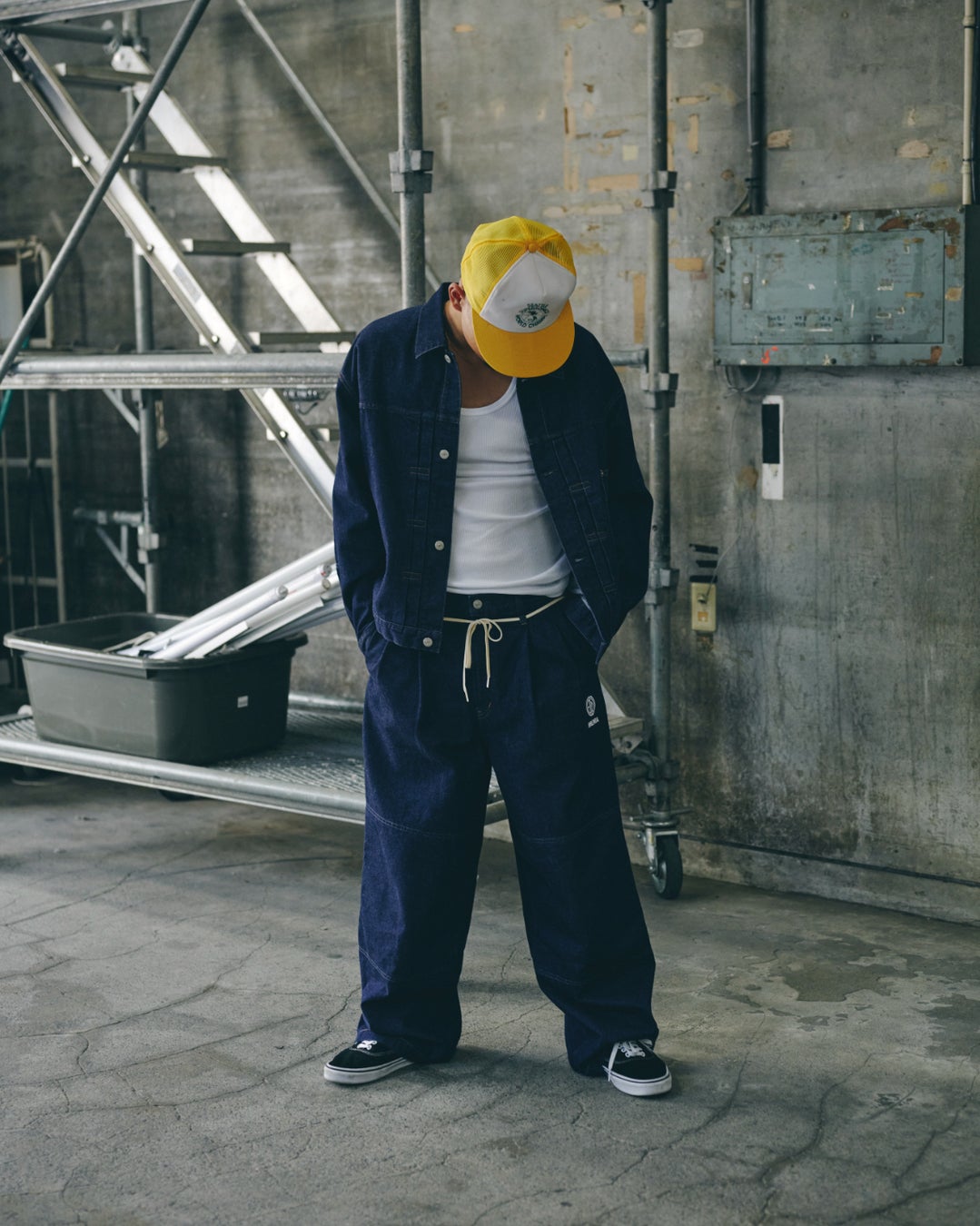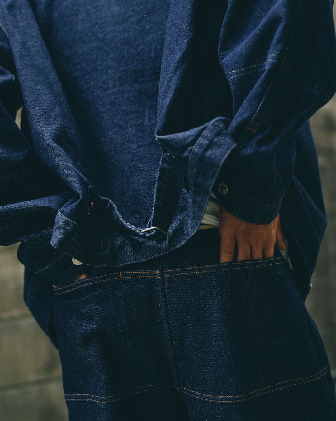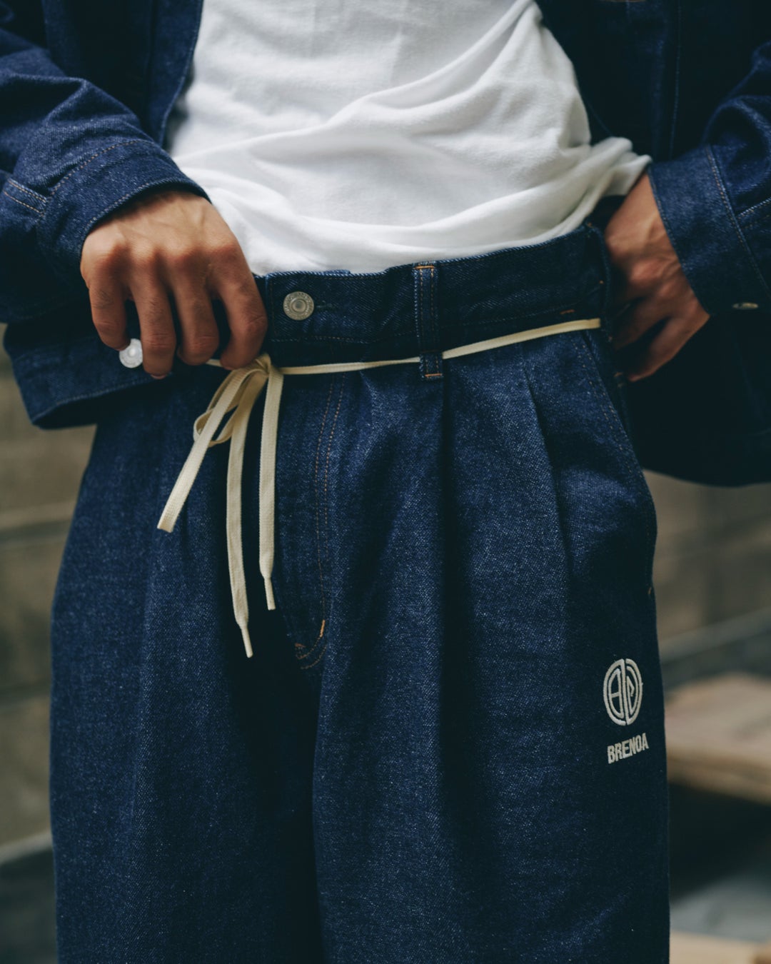 岡山デニムを使用した1WASH仕上げのワイドパンツ。
