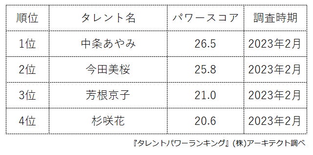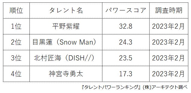 本ランキングは、2023年2月度に実施したタレント調査データ(一部過去実施データ)を利用し、タイトルに応じてランキング形式でまとめたものです。