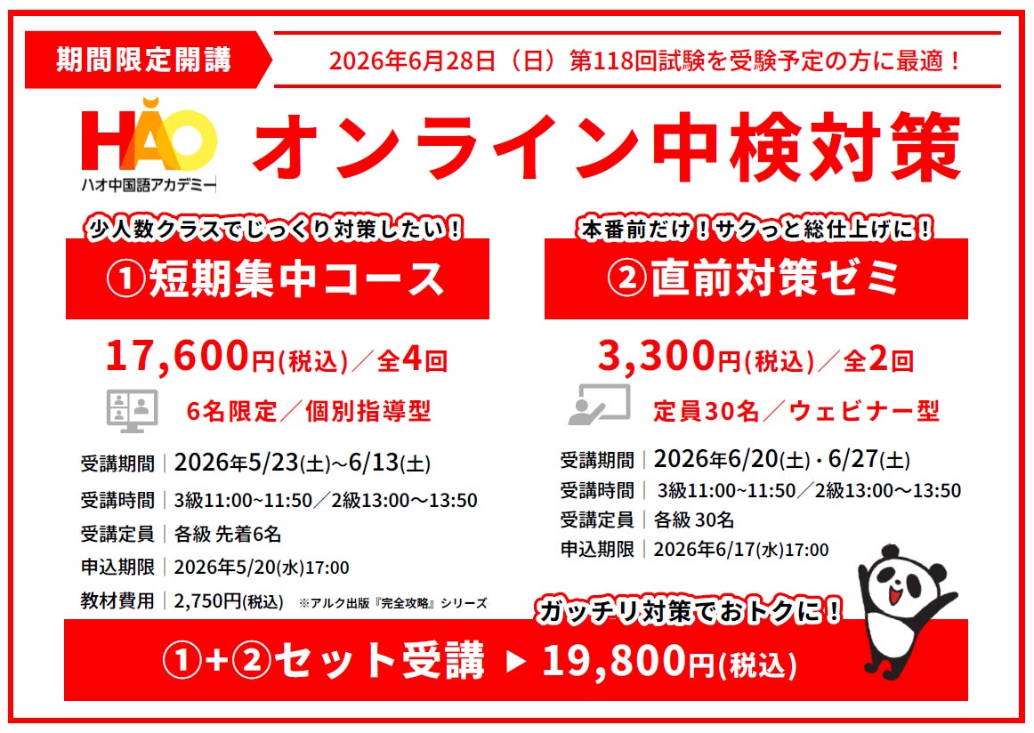 株式会社イーオン(本社:東京都新宿区、代表取締役社長:重野卓、以下「イーオン」)が運営するハオ中国語アカデミー(以下「ハオ」)は、2026年6月に実施される中国語検定(以下「中検」)の2級・3級対策として、5月から「短期集中コース(全4回)」を、6月に「直前対策ゼミ(全2回)」をオンラインで開講いたします。