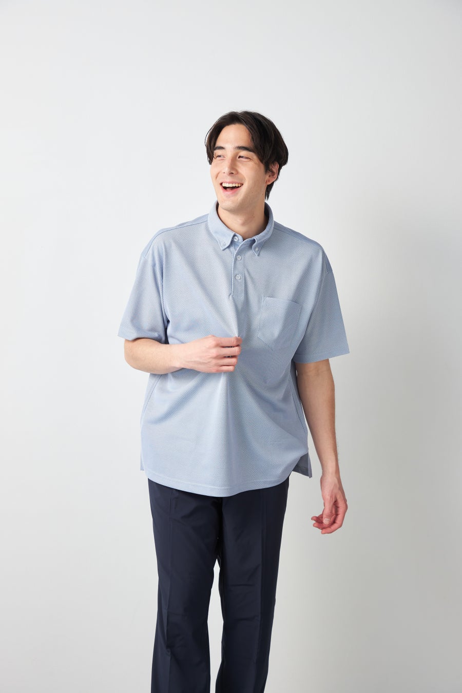 心地よい清涼感を提供するため、生地の表面は鹿の子目で独特な凹凸感を施しており、肌に直接触れる面積が少なく、通気性に優れています。また汗を素早く吸い上げ拡散し、その蒸発に伴う気化熱でひんやりとした冷涼感をキープします。さらに、脇下には消臭加工を施したテープを内蔵しており、汗による気になるニオイをしっかり抑制。暑い夏の日でも、朝から晩まで1日中安心してお過ごしいただける清潔感と快適さを追求しました。襟元は襟立ちの良いボタンダウン仕様のため、クールビズから休日のカジュアルスタイルまで、シーンを選ばず自信を持って着用できる一枚です。