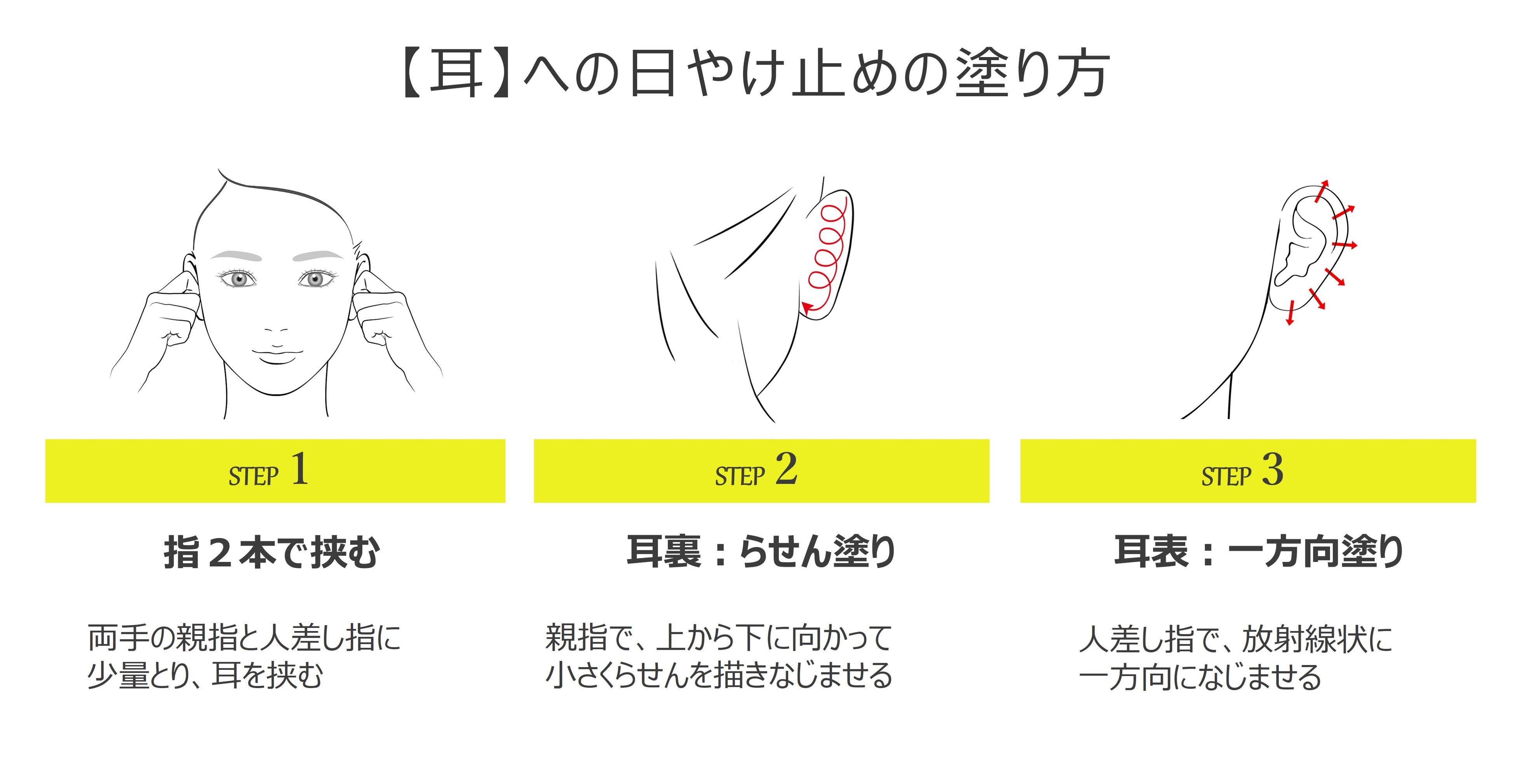 忘れがちなのが耳。今回の調査や塗りムラ実験を行った際にも、複数の方が意識していませんでした。指先に少量の日やけ止めをとり、耳を挟むようにして、耳裏は親指でらせん塗り、耳表は人差し指で一方向に塗り広げ全体に塗布します。
