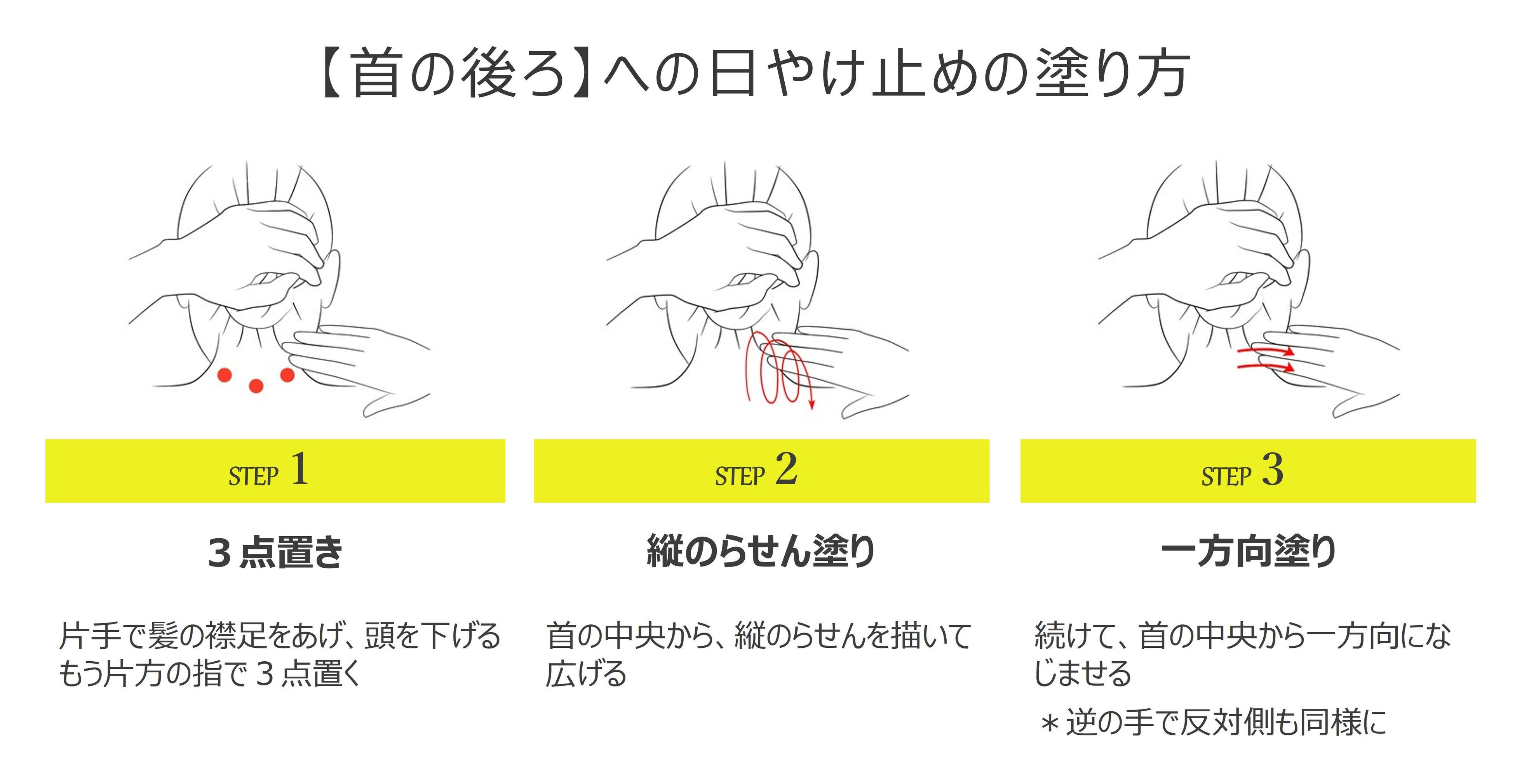 ① 首の後ろ: 髪をまとめて首の部分を露出します。やや頭を下げて、日やけ止めを3点置き、らせん塗りで広げてから、横に一方向塗りでぬりのばします。