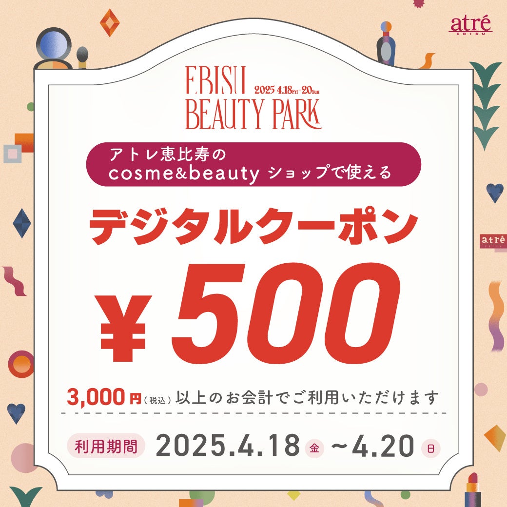 上記イベント参加者限定で、アトレ恵比寿のコスメビューティーショップで3,000円以上のお買物で使える500円デジタルクーポンをプレゼントします。
