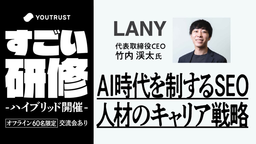 デジタルマーケティング支援を行う株式会社LANY(東京都渋谷区、代表取締役社長:竹内渓太)は、株式会社YOUTRUSTと共催にて、すごい研修『AI時代を制するSEO人材のキャリア戦略-注目すべきSEOトレンドとスキルセット-』を3/14(金)に開催いたします。