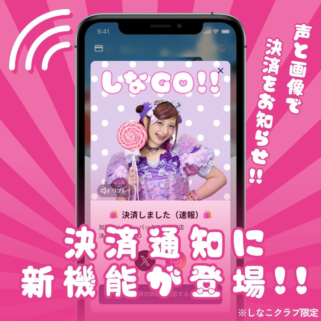Z世代を中心に大人気の原宿系クリエイター「しなこ」さんの公式カードでは、しなこさんの代表フレーズ「しなGO!」が流れる決済通知が登場。