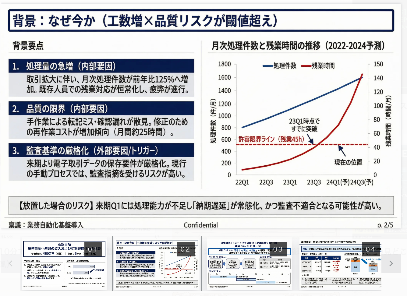 ChatSenseのスライド生成機能は、社内のPDF資料や議事録などのデータを読み込み、構成案の作成からスライド化までをAIが一気通貫で行います。今回のプロンプト事例を活用することで、デザインの調整にかかる時間すら短縮し、通常数時間かかる作業を約2分程度で完了させることが可能です。