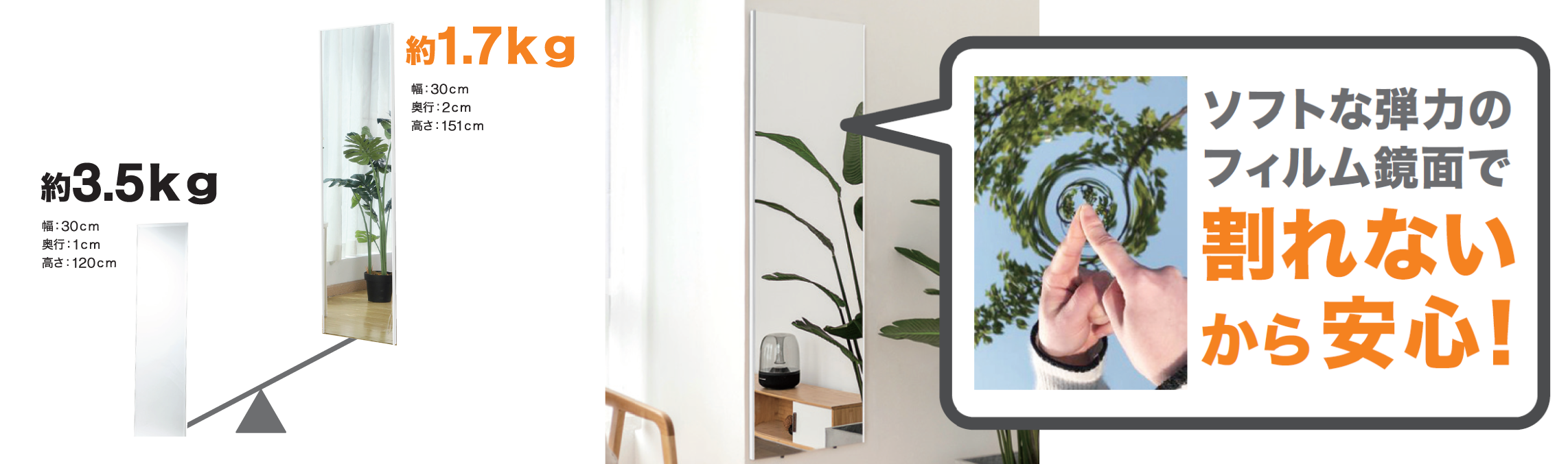 この度ニトリは、「ミラーが割れるとガラスの破片が飛び散って、怪我が心配」というお客様の声にお応えし、割れない軽量のフィルムミラーを発売しました。
