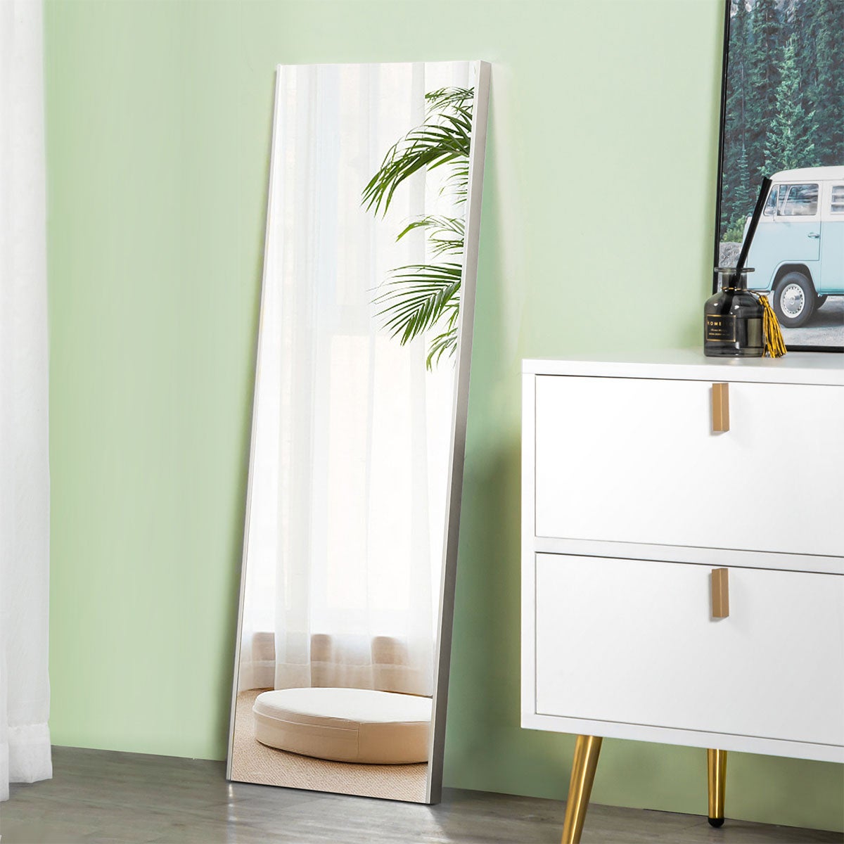 ガラスミラーよりも軽いため(※)、大型サイズのミラーを楽に持ち上げられます。簡単に動かすことができるので、床の清掃時に便利です。また、壁掛け使用する際は、耐荷重や壁穴への負担が軽減されます。