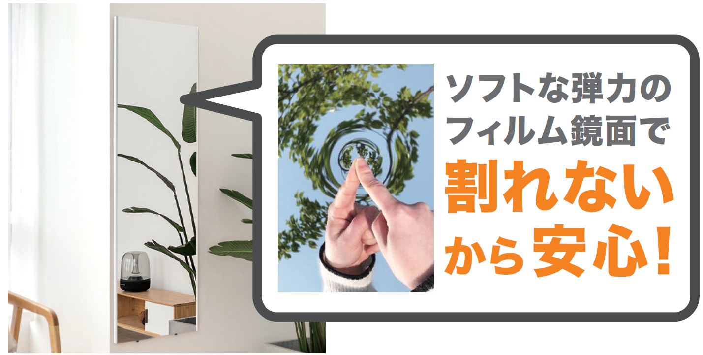 ソフトな弾力のフィルム鏡面を使用しているため割れないので、地震対策におすすめです。