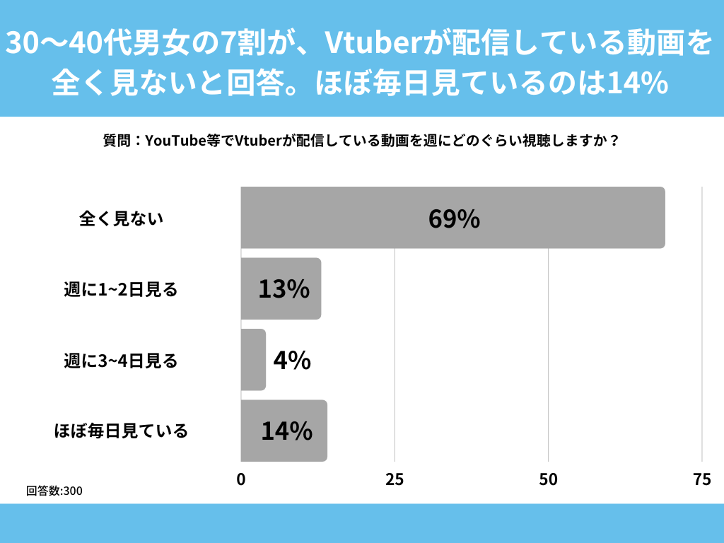 30代〜40代の男女を対象とした「YouTube等でVtuberが配信している動画を週にどのぐらい視聴しますか?」というアンケートで最も多かった回答は「全く見ない」で69%でした。
