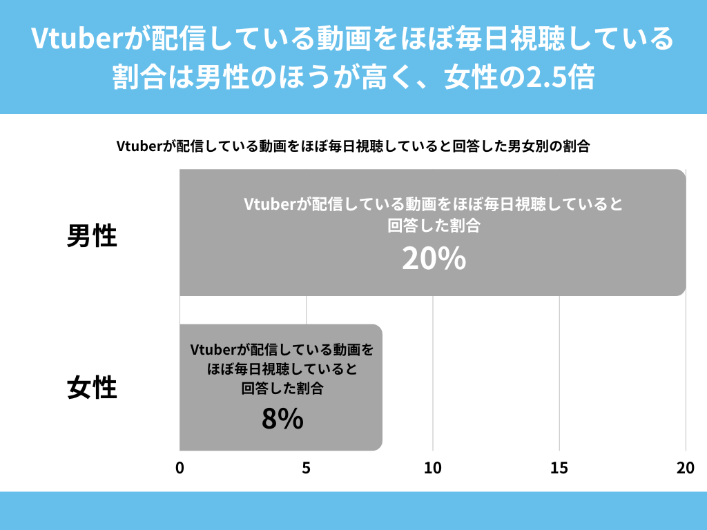 Vtuberが配信している動画をほぼ毎日視聴していると回答した割合を男女別でみてみますと、男性が20%、女性が8%という結果になりました。