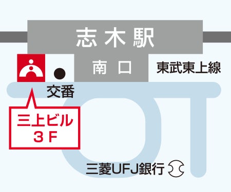 東武東上線志木駅南口を出て、ロータリー沿いに右手へ進みます。志木駅南口交番の横にある三上ビルの3FがTOMAS志木校です。